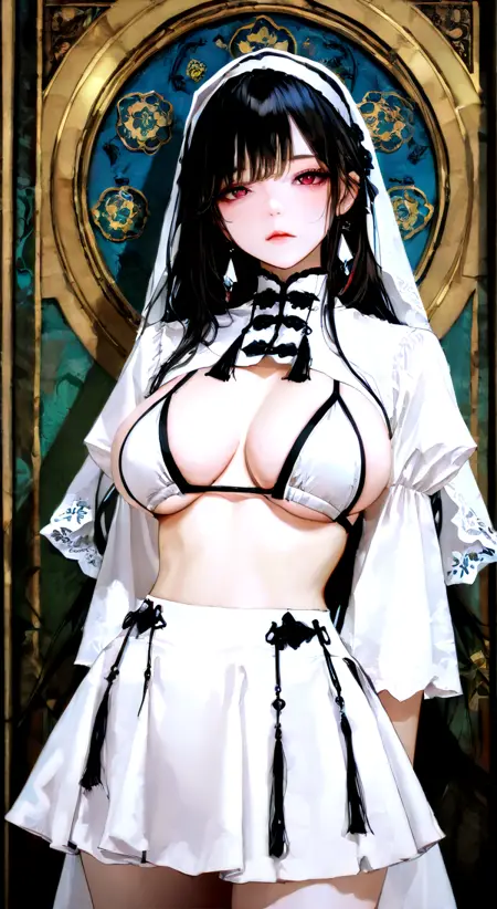 プロンプトワード: white_skirt_bikini, ビキニ, 白いスカート, 衣類を持ち上げる, かんぬき \\(服\\)