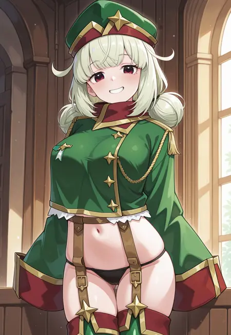 military hat, military jacket, cropped jacket, insignia, aiguillette, long sleeves, garter belt, black panties, thigh boots, sleeves past wrists,