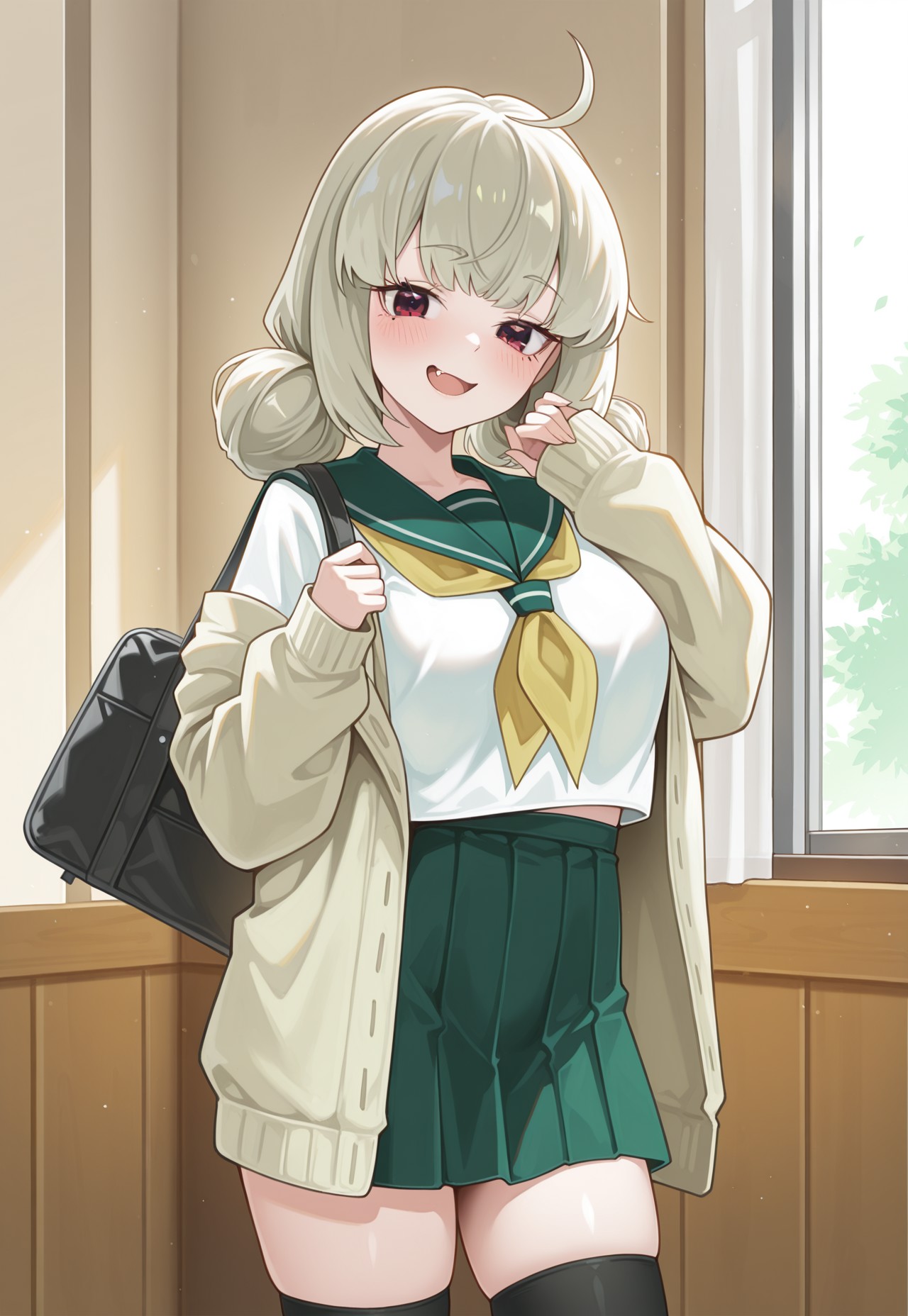 green sailor collar, school uniform, sweater, green skirt, black legwear, red slippers,