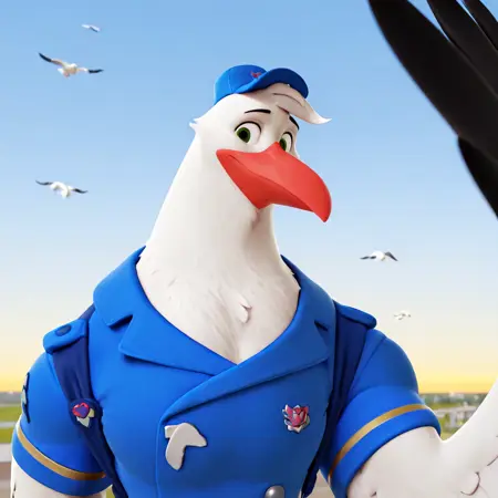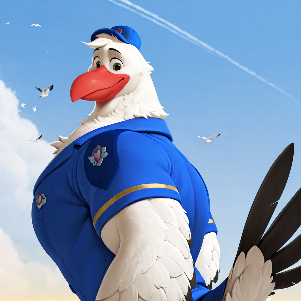 bird, male, red beak, bara, muscles, white feathers, black wing tips, blue uniform