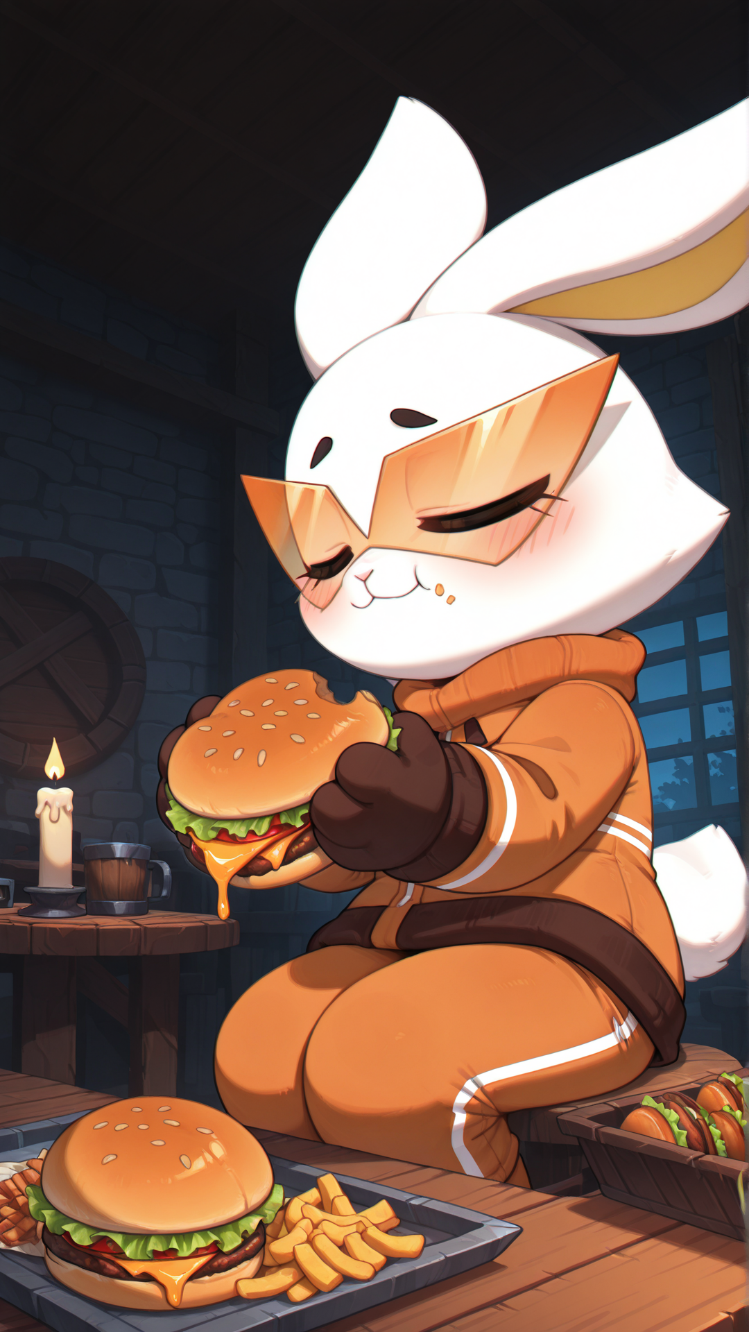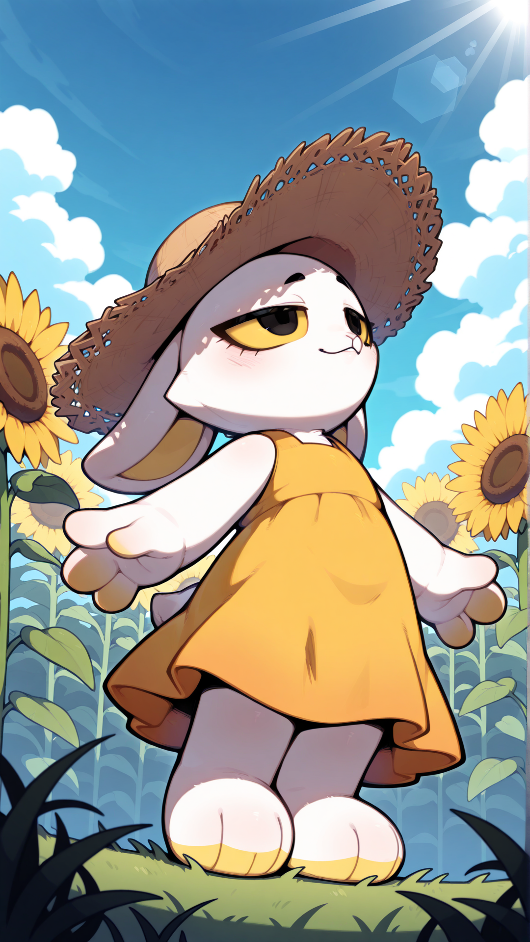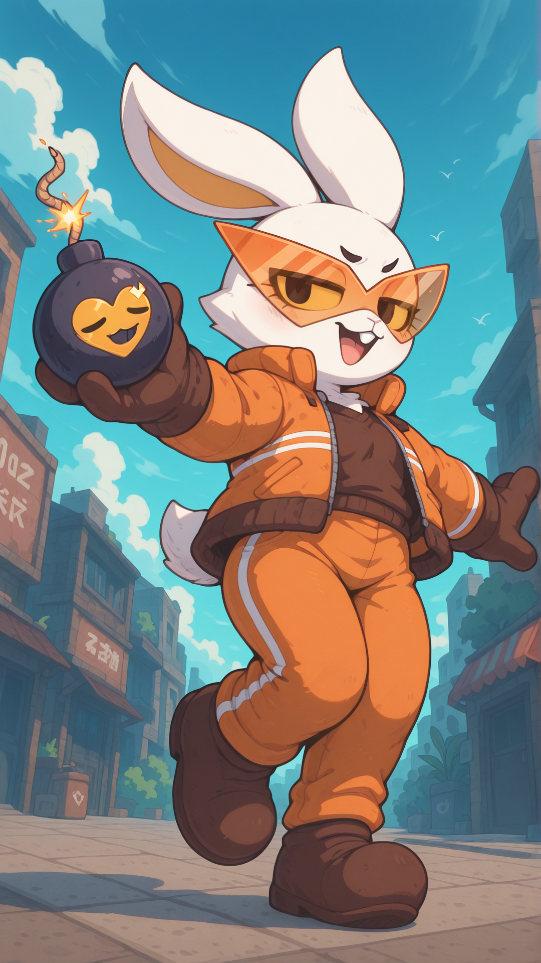 1girl, b0mbun, rabbit girl, b0m_sunglasses, b0m_jacket, gloves, shoes, yellow sclera, tail,