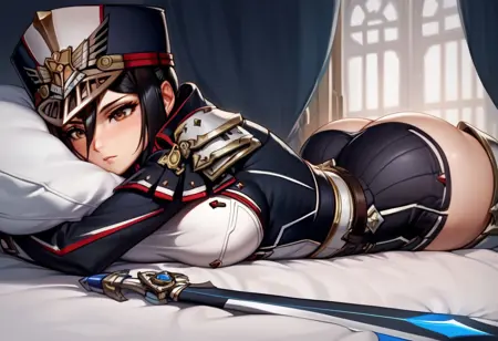 (Xenoblade_Morag, 단발, 검은색 머리, 갈색 눈, 눈 사이의 머리카락, 군복, 모자, 갑옷, 어깨판, 유니폼, 허벅지 부츠, 검)