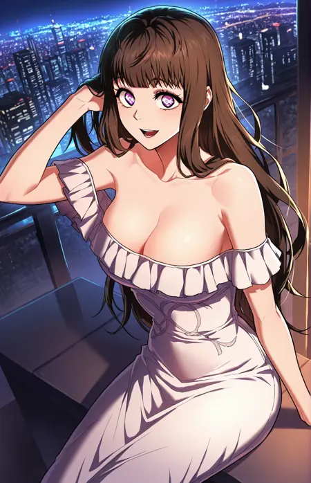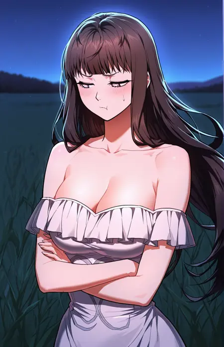 Shinka_outfit2、白いドレス、オフショルダードレス、ストラップレスドレス、肩を露出、鎖骨、胸元、フリルのネックライン、オフショルダーのネックライン、フィットしたウエスト、ロングドレス、マーメイドスカート、ハイヒール、