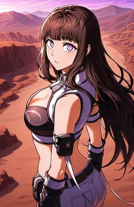 シンカ、1人女の子、単体、紫の目、シンボル瞳、濃い茶色の髪、長い髪、ストレートの前髪、長い横髪、