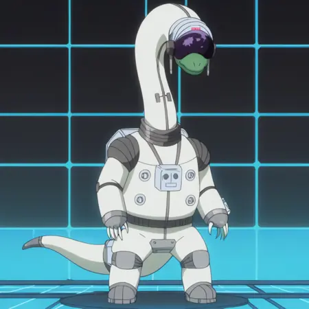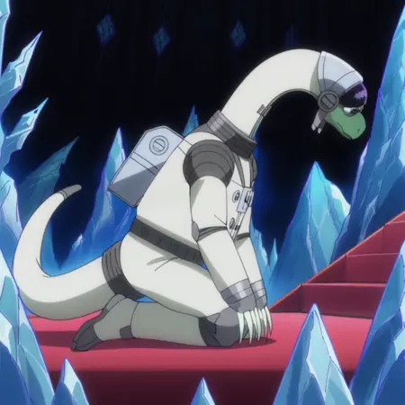 Prompts: no humans, dinosaur, anthro, male, green skin, helmet, visor, long neck, spacesuit, backpack, claws, tail, outdoors (town/sky/cloud/tower/buildings/tree), spaceship interior/ice/crystal/red carpet, holographic interface/round blue platform, yellow background, turquoise background/spirals in background