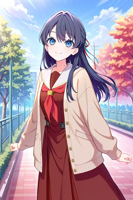 開いたカーディガン、開いた服、プリーツスカート、赤いネクチーフ、セーラー襟、セーラー服、学校制服、白いセーラー襟、冬服、