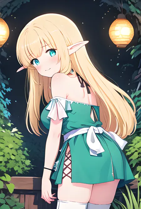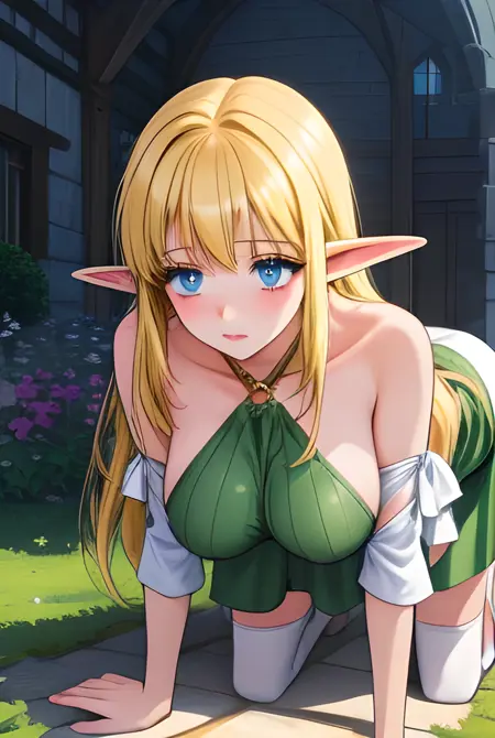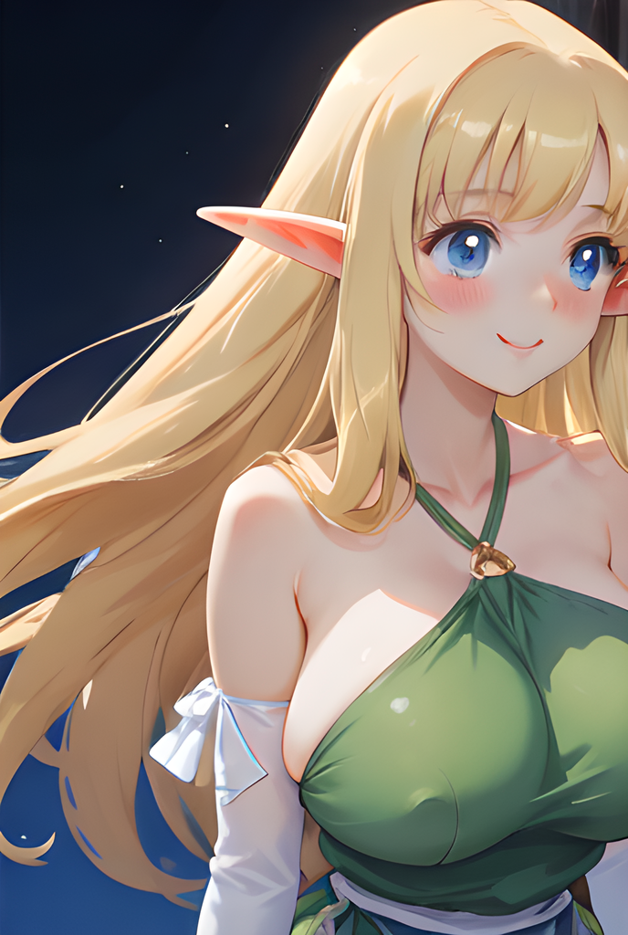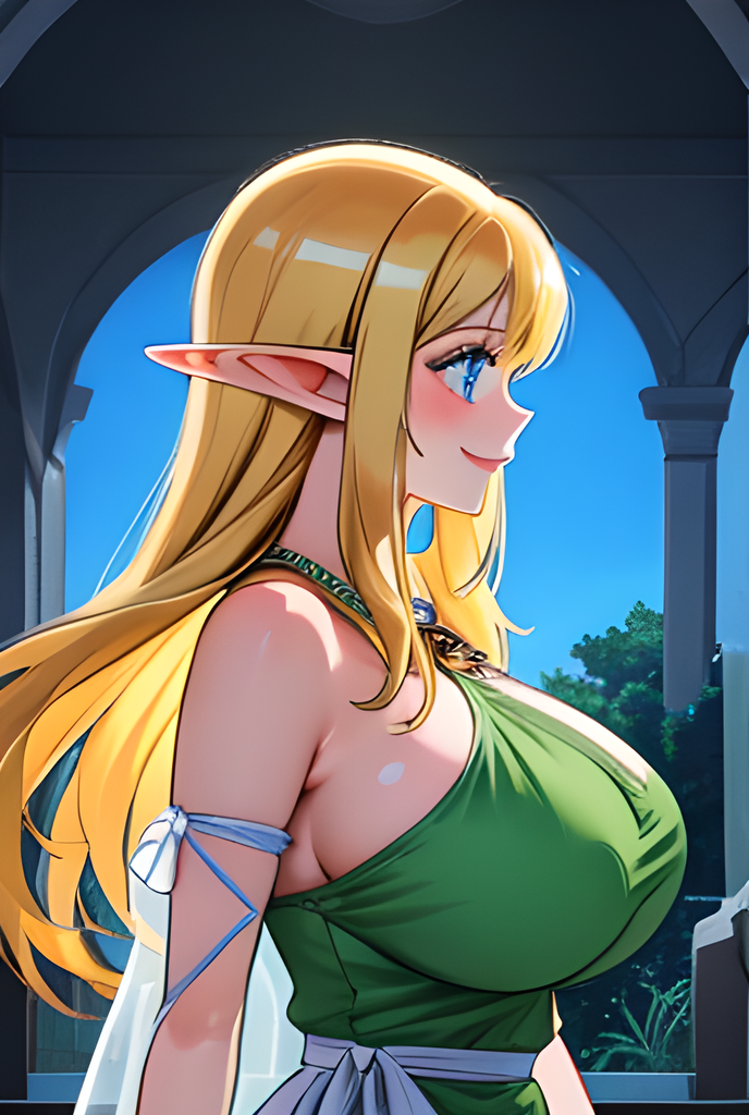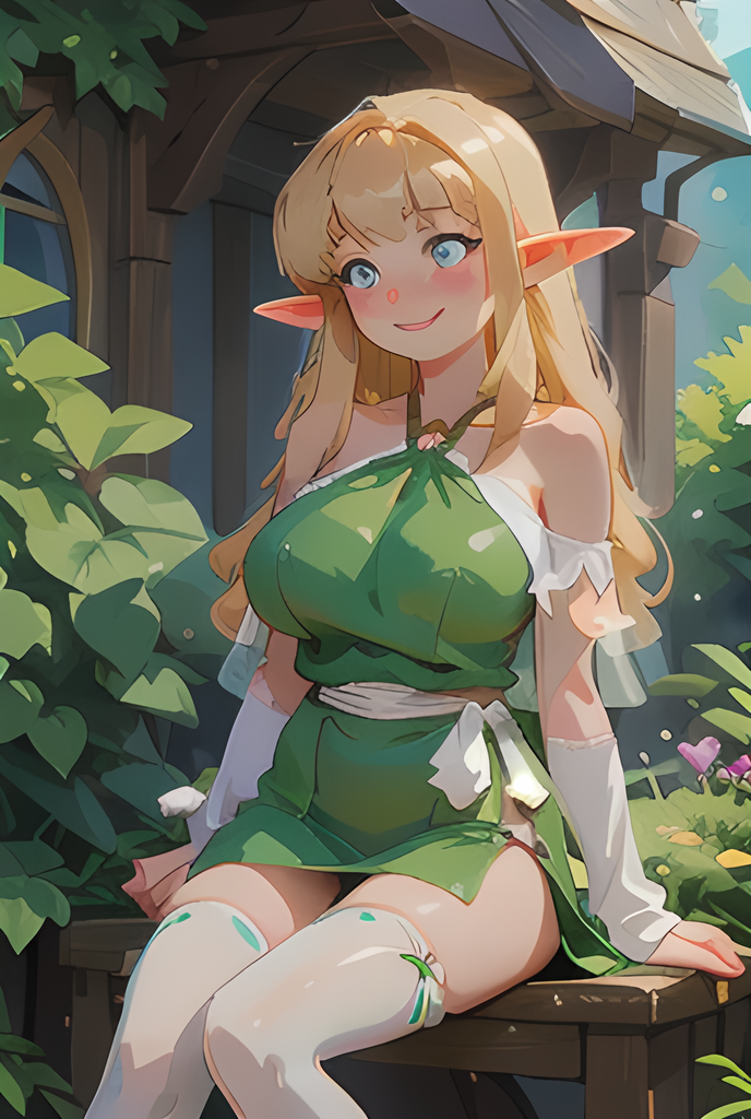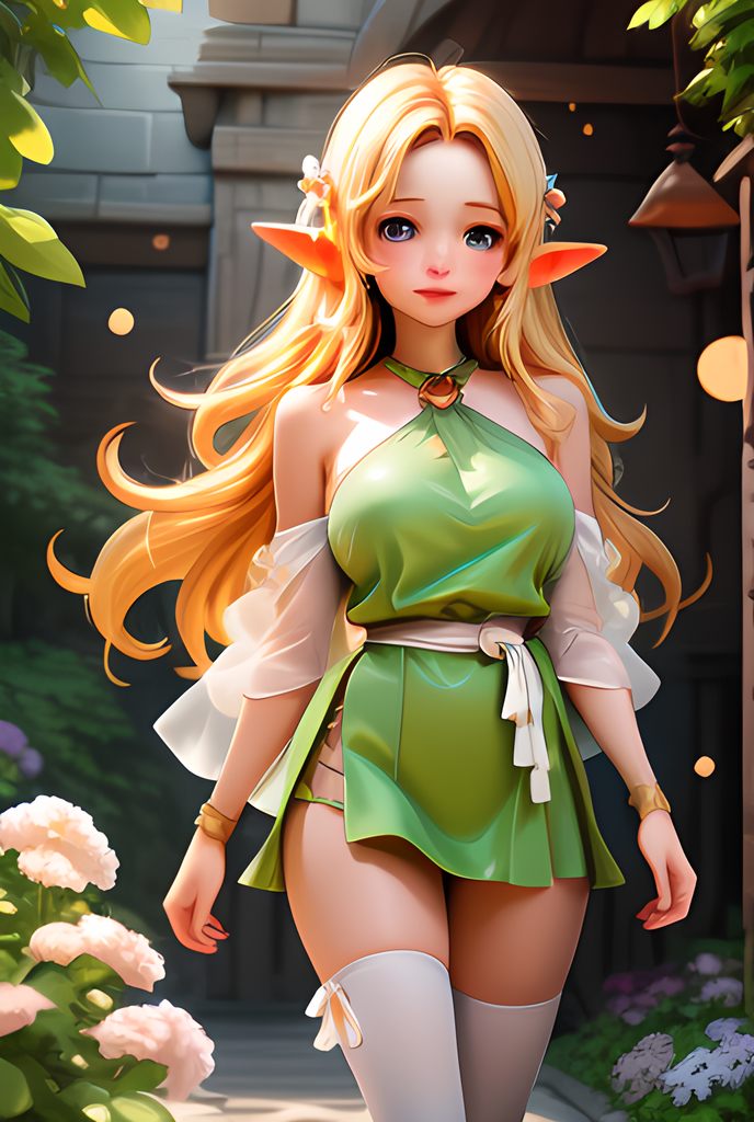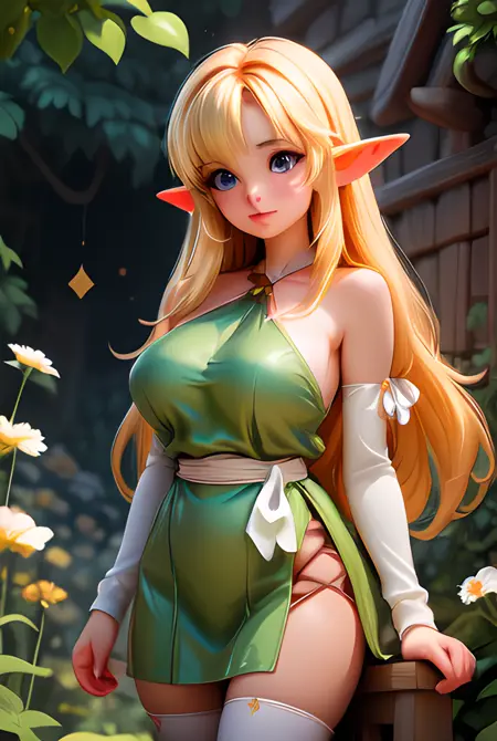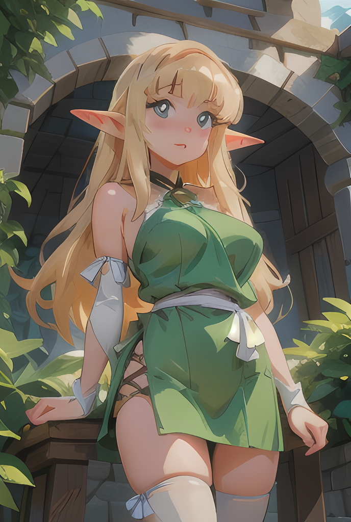 This LoRA faithfully reproduces Tiffania's signature characteristics including her flowing long blonde hair, distinctive pointed elf ears, and expressive blue eyes. The model excels at capturing her mature yet gentle appearance, along with her typical green tunic outfit.