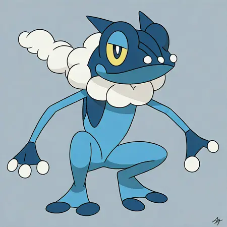 提示词:Frogadier_(Pokemon),pokemon_(creature),solo,dark blue and light blue skin, multicolor skin,three_fingers,anime,bubble_neck_scarf,white_bubbles,blue_body,webbed_hands,white bubble neck scarf