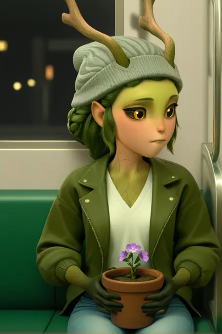 Nari_Toa、緑の肌、緑の髪、編み髪、花の髪飾り、ツノ、黒い白色、黄色い目、暗い静脈