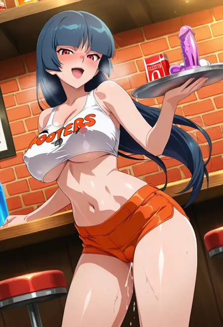 Sabrina, navy blue_hair, long_hair, bangs,red eyes, large_breasts,