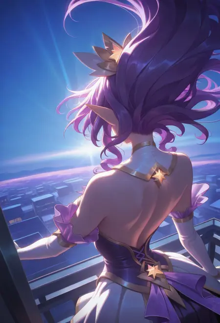 sgjanna, large breasts, hair ornament, purple hair, long hair, floating hair,blue eyes,bare shoulders, elbow gloves, magical girl,detached sleeves, high heels, white thighhighs,elbow gloves,pointy ears, skirt,bangs,dress