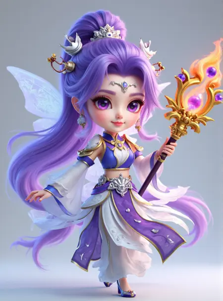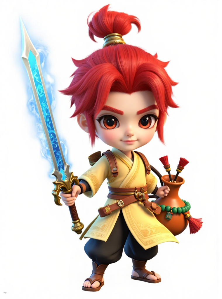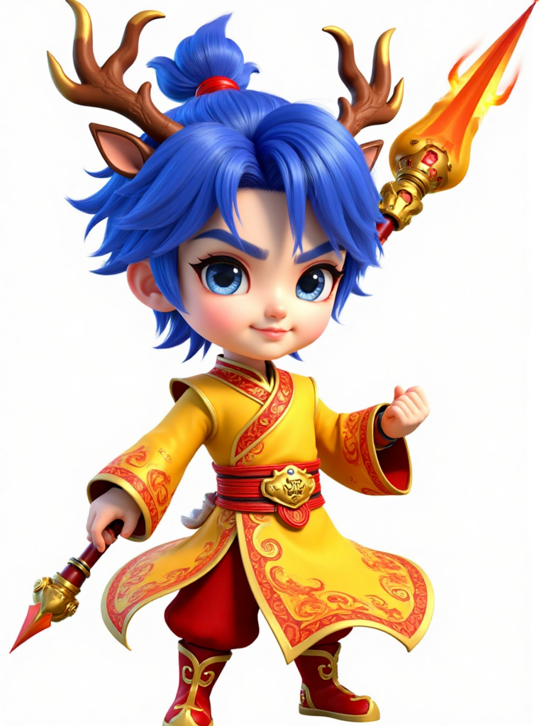 3d chinese chibi, A young man with blue hair tied in a high ponytail, adorned with red felt balls and blue angular decorations. He was wearing a white and yellow robe adorned with delicate patterns, with gold accents on the shoulders and waist displaying luxury. He held a red feathered spear surrounded by a blue dragon shaped silhouette, and held a ball emitting blue light, exuding a sense of majesty as if he could summon wind and rain