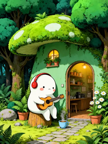 IBB_MushroomHouse,Forest Illustration,Moebius (Jean Giraud) style,maximalism,extreme expressiveness,romantic feeling,extreme expressiveness,perfect details,masterpiece. Forest sanctuary,mysterious summer,clean image,rich colors. Hand-drawn,pen drawing. Close-up shot,a round white creature is the store manager,wearing a mini headphone,holding a ukulele (or a large leaf instrument),sitting on a wooden post at the store entrance,its small foot gently swaying to the music,expression is intoxicated and relaxed,next to it is a cup of hot flower tea. Extreme emerald green.,