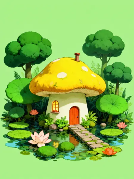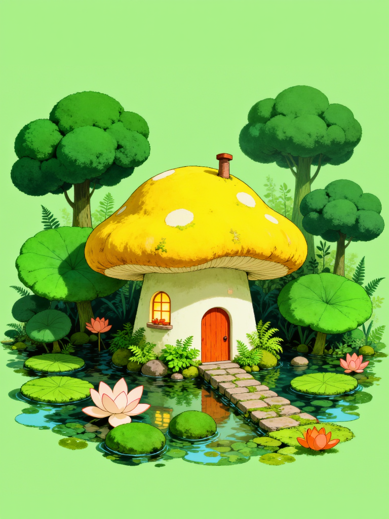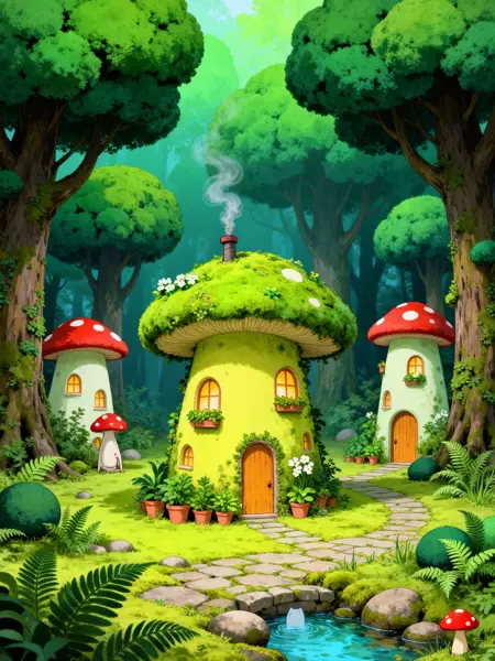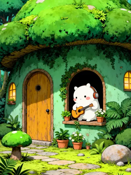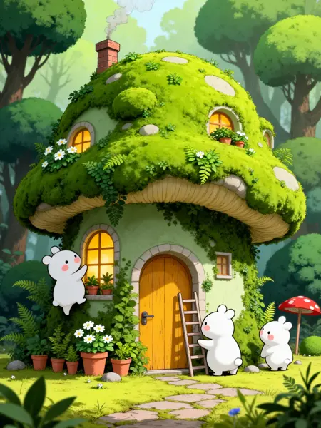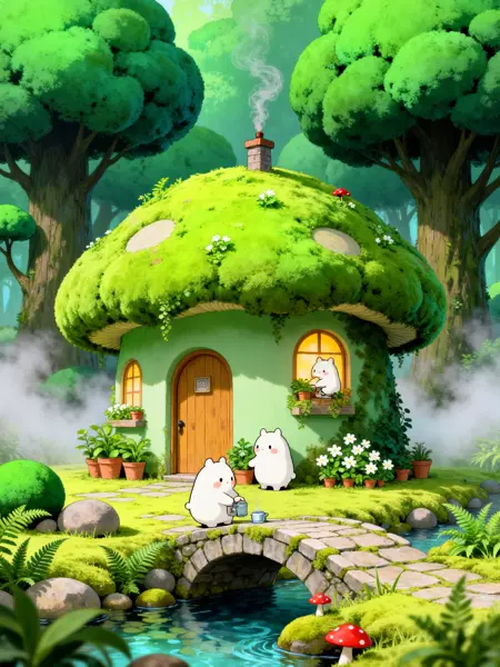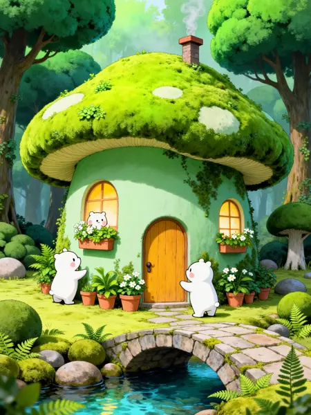 IBB_MushroomHouse,Healing,.This is a high-quality, digital illustration with a very high aesthetic quality, showcasing a whimsical, fairytale-like scene. The central subject is a charming, round, moss-covered cottage nestled in a lush, green forest. The cottage has a soft, pastel green exterior with a large, round window and a small, arched wooden door. Surrounding the cottage are potted flowers and a few small, white, bear-like characters, adding a playful touch.The foreground features a small, stone bridge over a clear, blue stream, with ferns and other plants enhancing the natural setting. The background is slightly blurred, focusing attention on the cottage and its immediate surroundings. The lighting appears to be natural, with soft sunlight filtering through the trees, creating a serene and magical atmosphere. The overall style is reminiscent of classic children's storybooks, with a charming and enchanting aesthetic.