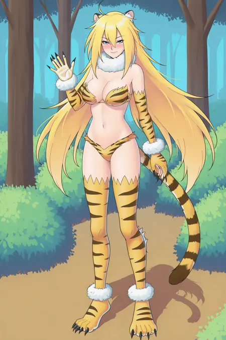 ➜ AlmaMSAILXL, 蓝眼睛, 金发, 长发, 天线发, 发丝遮眼, 老虎耳朵, 老虎尾巴, 大胸, 毛领, 老虎纹, 文胸, 肘部手套, 毛皮手环, 动物手掌, 黑色爪子, 内裤, 黄色过膝袜, 老虎脚掌