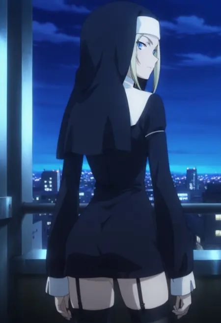 blonde hair, blue eyes, nun, habit, short dress, garter straps, black thighhighs