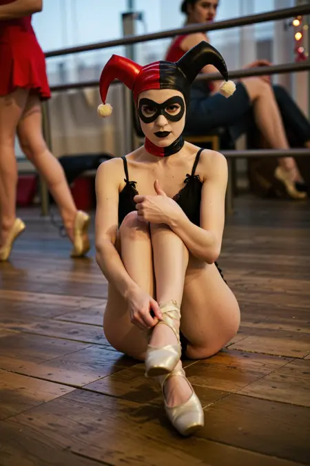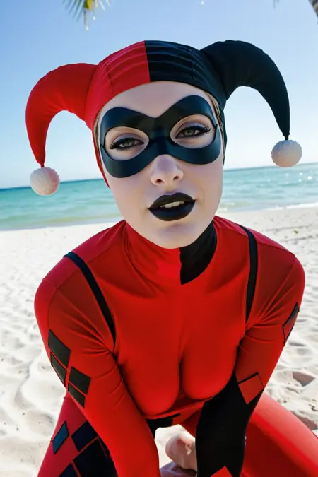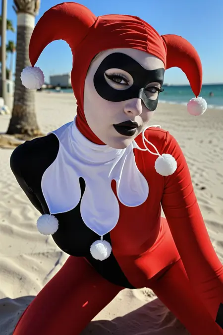 触发词:多米诺面具、黑色口红妆容、小丑帽、连体衣、红色连体衣、手套