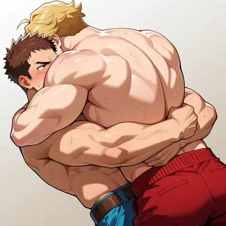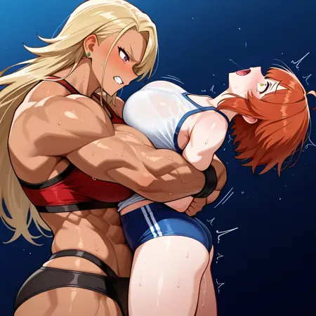 bearhug_IL, 1girl, 1boy, ryona, lifting person, arched back, pain