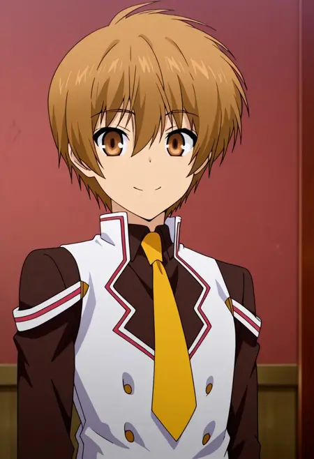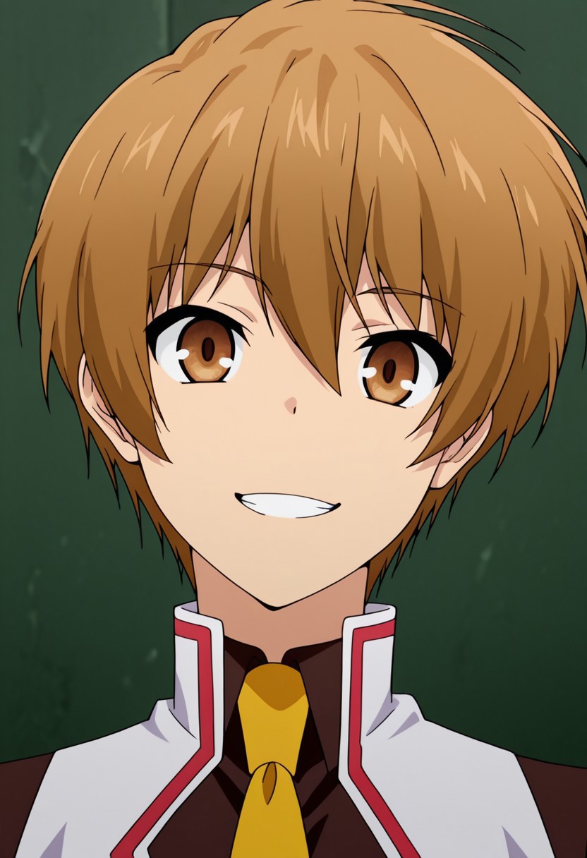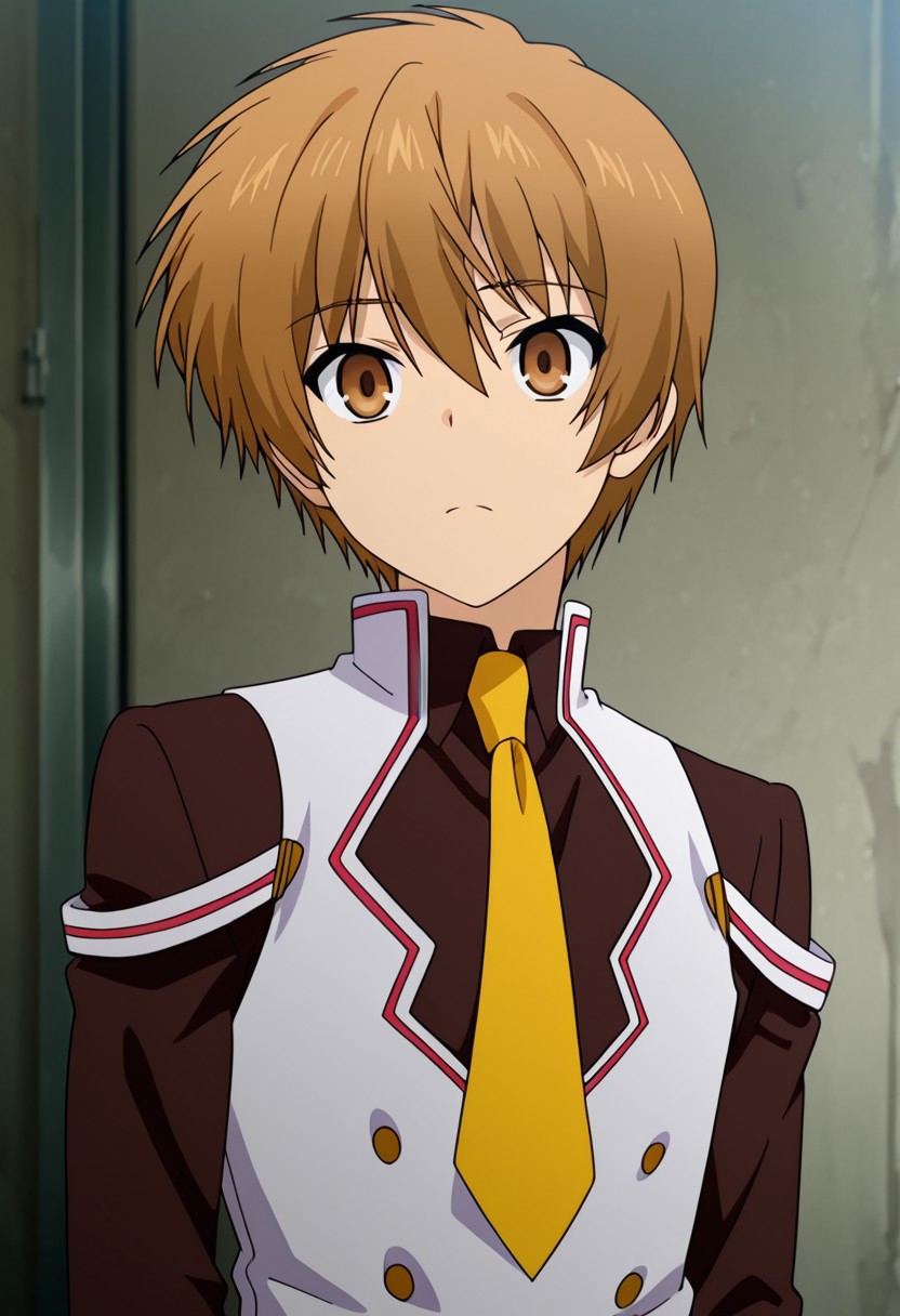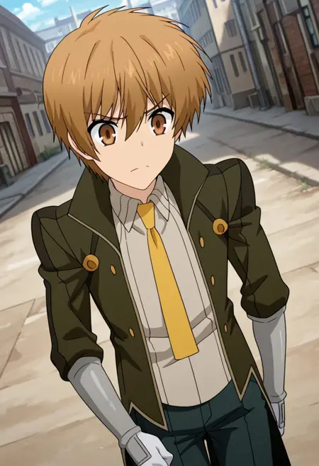 1boy, male focus, solo, brown eyes, brown hair, school uniform, brown shirt, collared shirt, yellow necktie, white vest, brown pants, shoes, brown footwear,