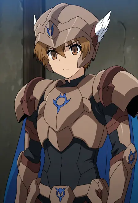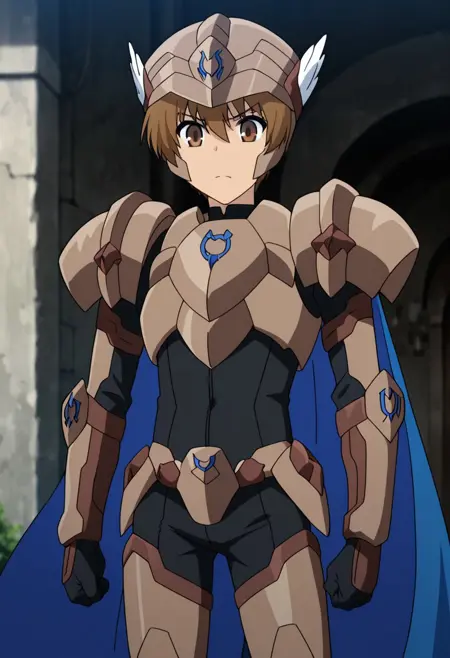 1boy, male focus, solo, brown eyes, brown hair, helmet, black bodysuit, brown armor, pauldrons, blue cape, gloves, armored boots,