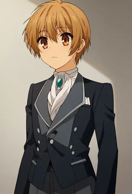 1boy, male focus, solo, brown eyes, brown hair, white shirt, white ascot, brooch, black jacket, frilled sleeves, black pants,
