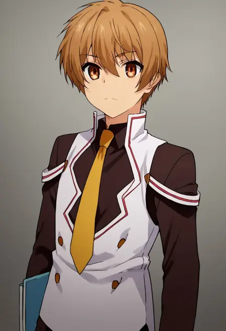 1boy, male focus, solo, brown eyes, brown hair, school uniform, brown shirt, collared shirt, yellow necktie, white vest, brown pants, shoes, brown footwear,