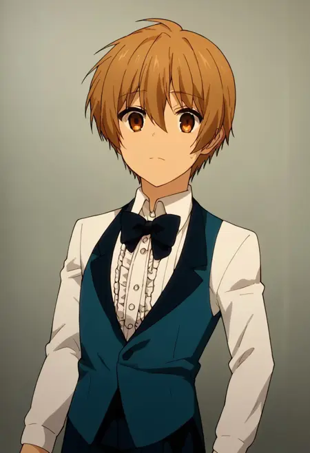 1boy, male focus, solo, brown eyes, brown hair, dress shirt, white shirt, bowtie, center frills, blue vest, blue pants,