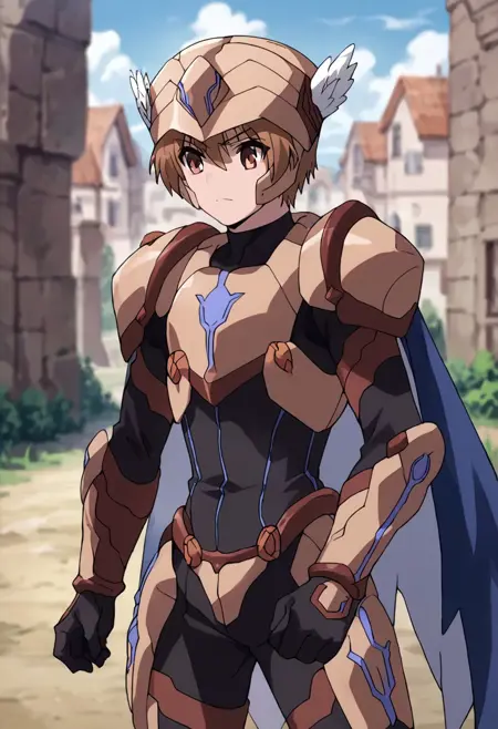 1boy, male focus, solo, brown eyes, brown hair, helmet, black bodysuit, brown armor, pauldrons, blue cape, gloves, armored boots,