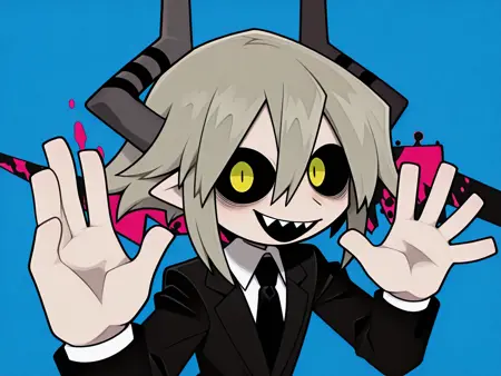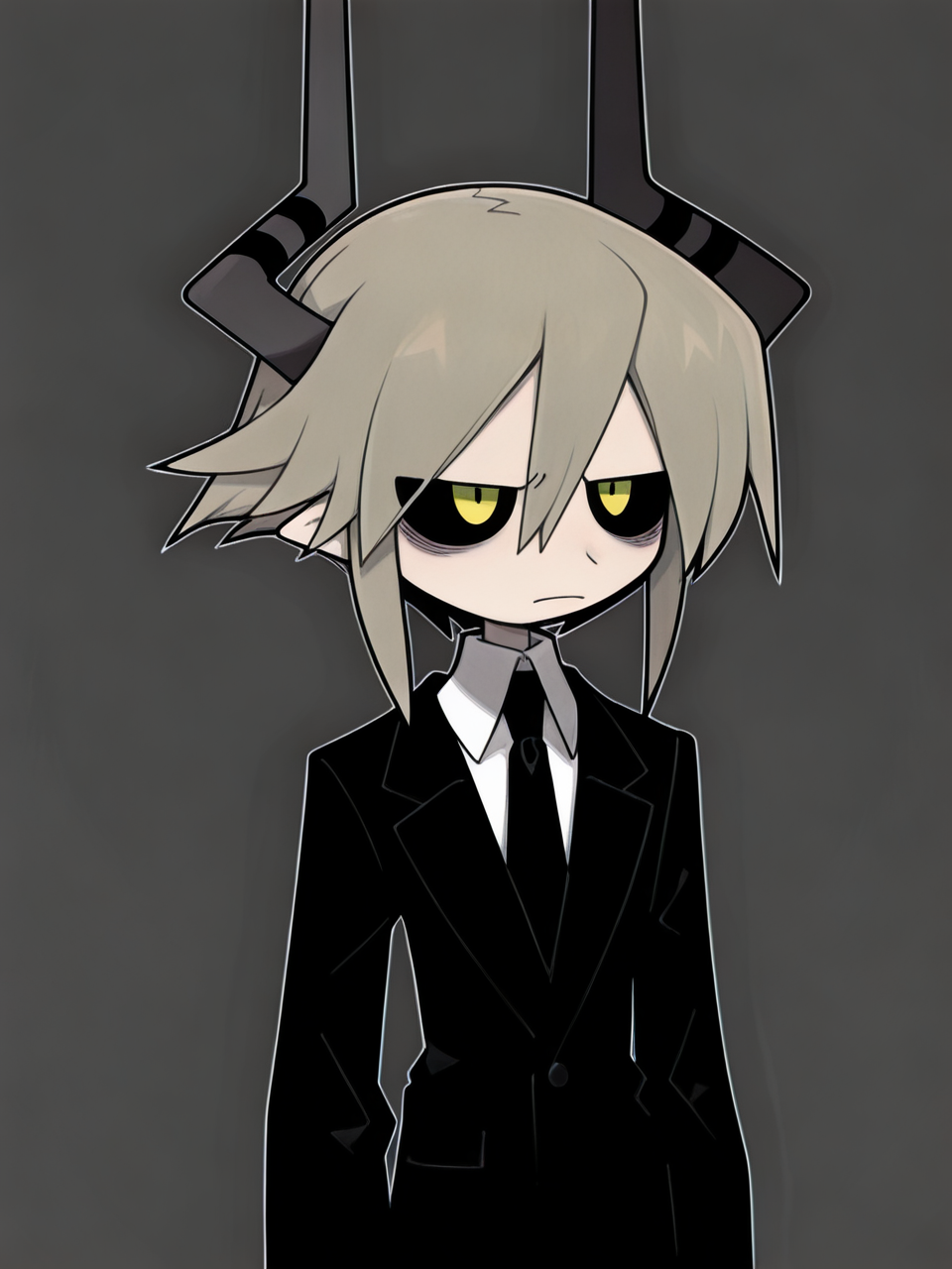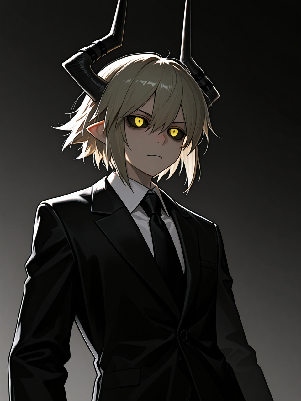 SullivanOkeg,1boy,black sclera,collared shirt,colored sclera,demon boy,horns,yellow eyes,short hair,pointy ears,black necktie,demon horns,