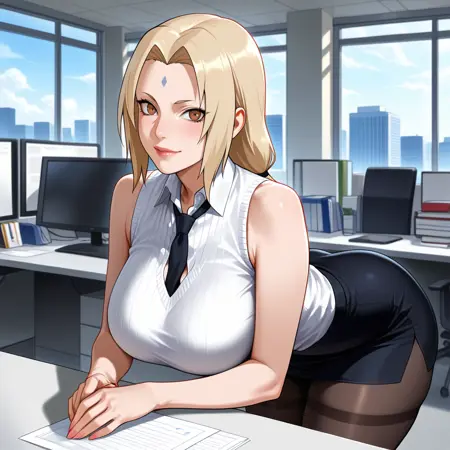 正面提示词:masterpiece, Extreme details,best quality, absurdres,Tsunade,1mature woman,brown eyes, 1girl,white Sleeveless Sweater, black skirt,black tie,black stockings,solo,large breasts,wide hips, looking at viewer, (modern office:1.2), perfect skin,office background,8k resolution,