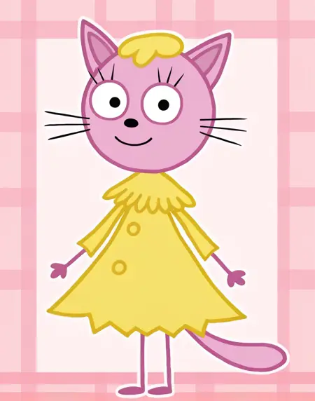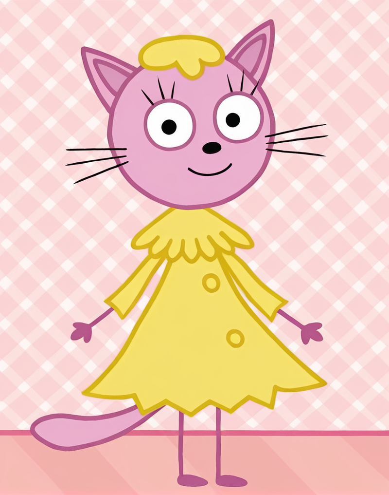 Lapo4ka, cat, furry, furry female, 1girl, pink fur, yellow hair, very short hair, cat whiskers, cat ears, cat tail, dress, yellow dress