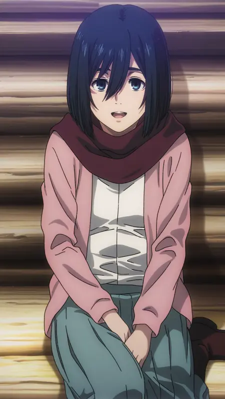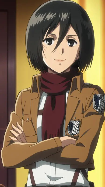 s34s0n 4, 마지막 4ttack 복장, 짧은 머리, 흰색 칼라 셔츠, 검은색 바지, 검은색 마이크로스커트, 검은색 부츠, 회색 다리 보호대, 0dm 하네스, 팔꿈치 패드,