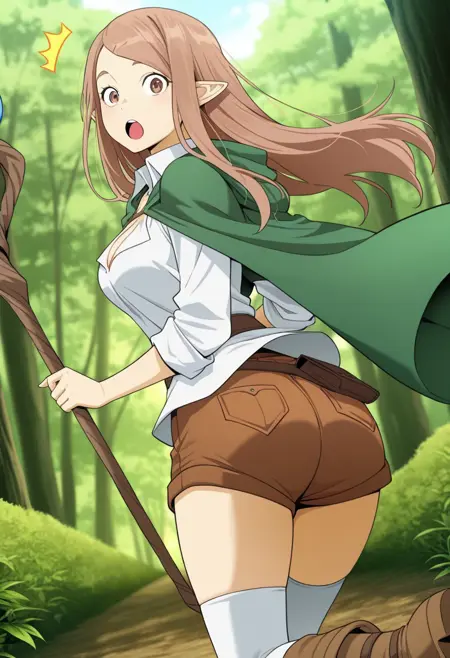 traveling_outfit, shorts, shirt, cleavage, cape, thighboots, staff