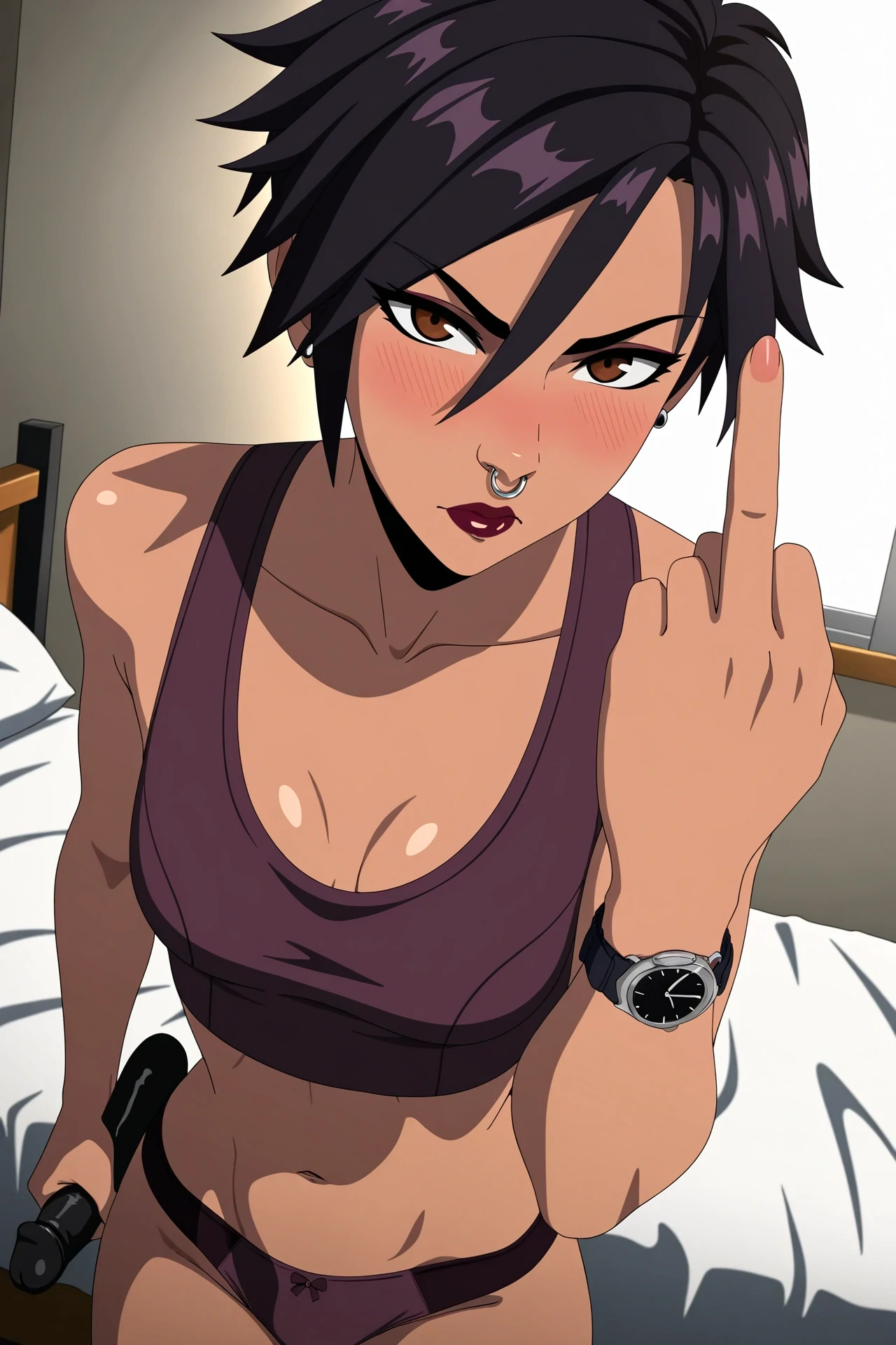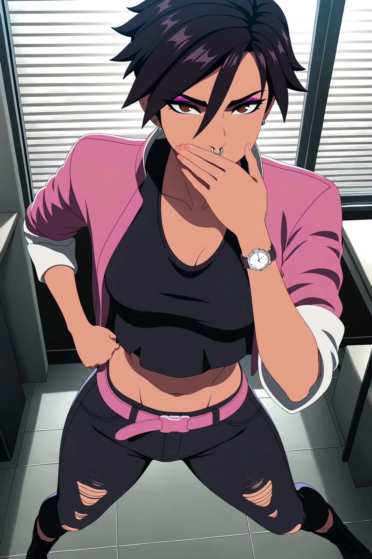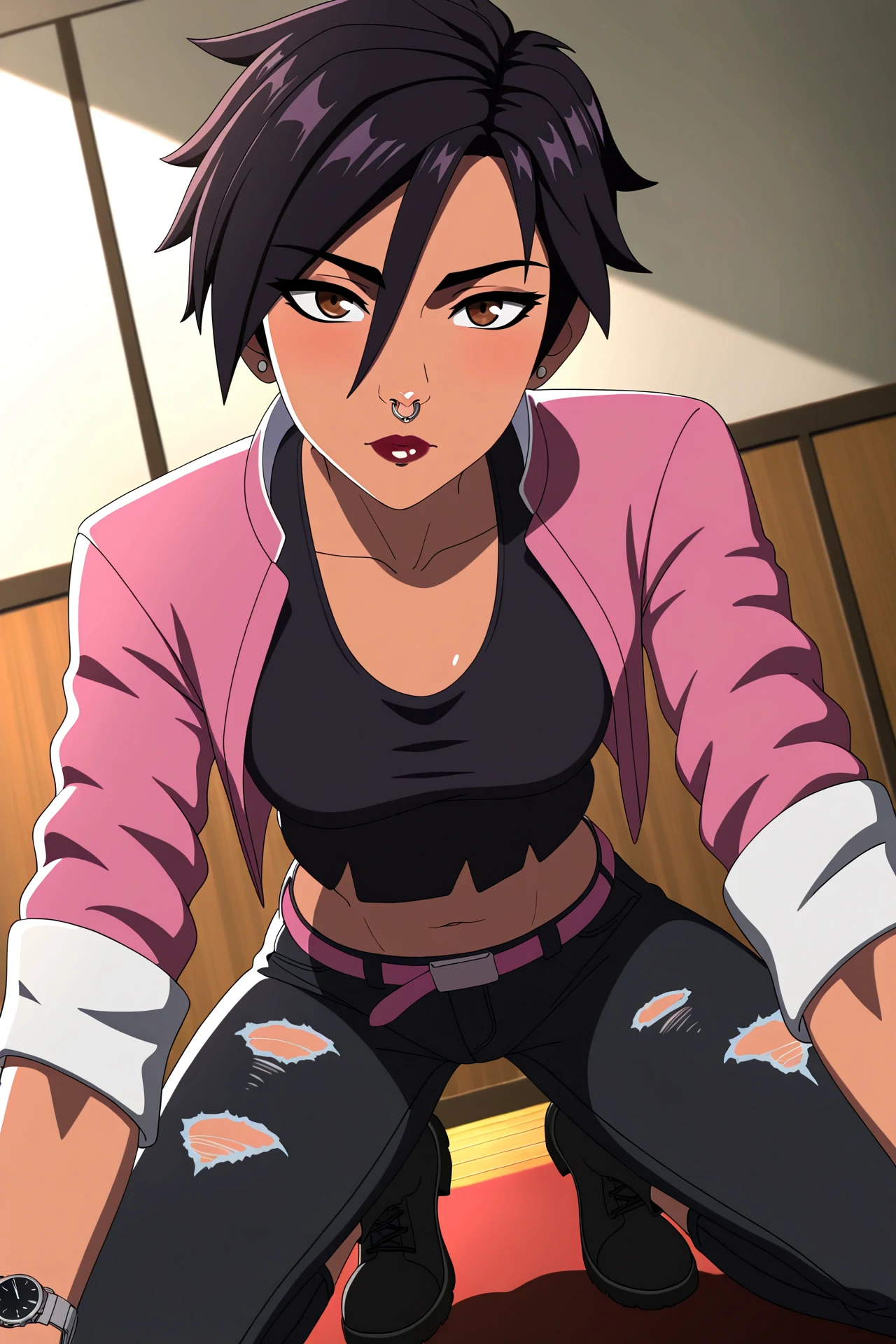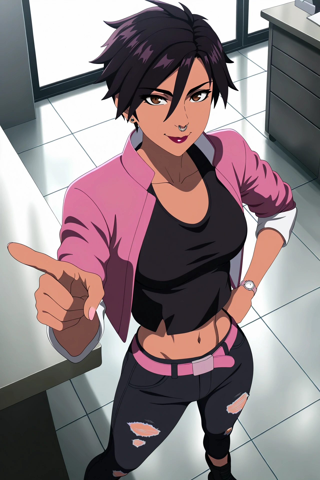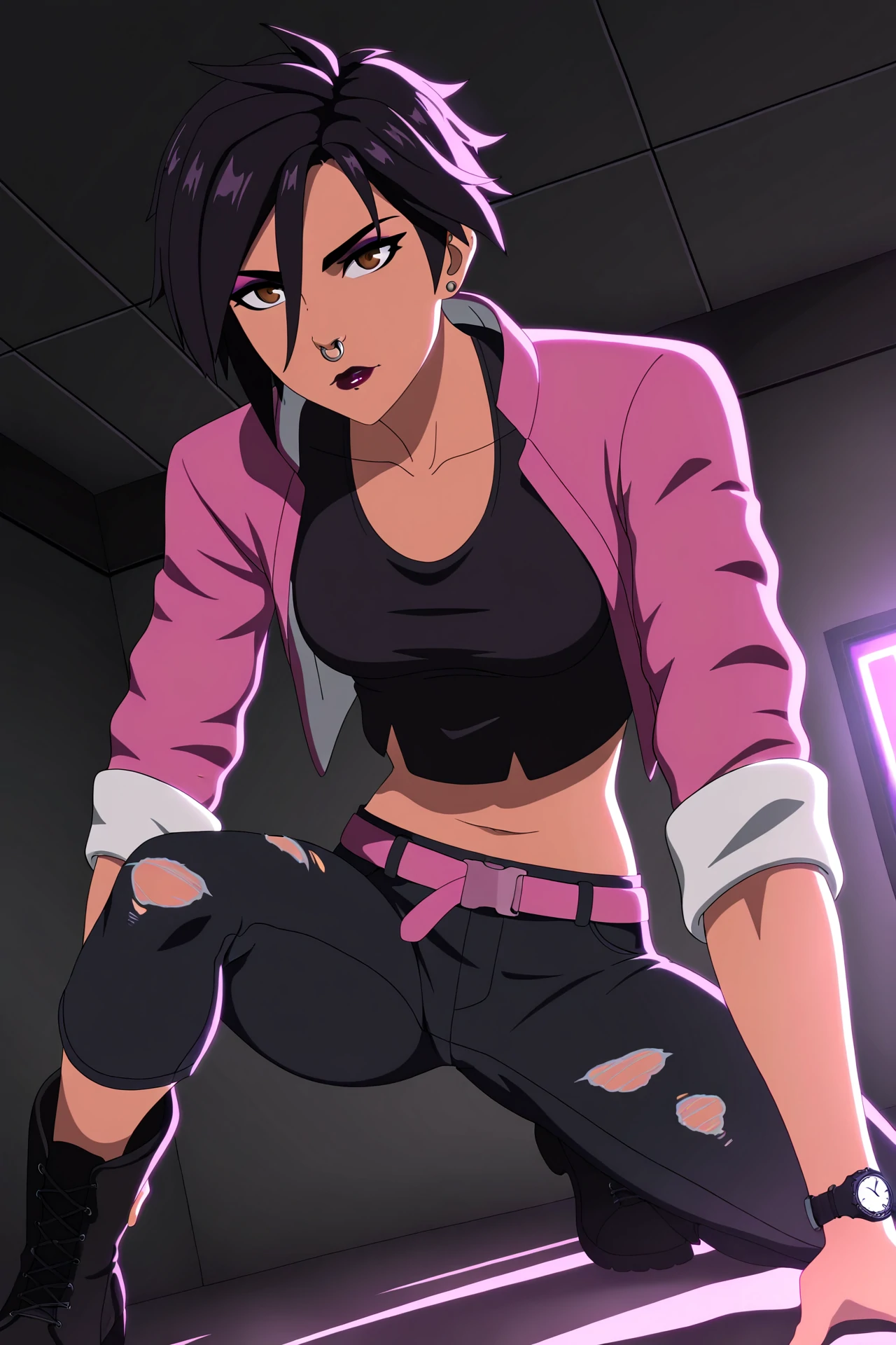 | Trained Words | 1girl, solo, animification,Copied! invisigal, tomboy, brown eyes, black hair, short hair, bangs, hair between eyes, jewelry, earrings, piercing, nose piercing, nose ring, makeup, lipstick, breasts, watch, wristwatch,Copied! torn clothes, pink jacket, cropped jacket, open jacket, sleeves pushed up, black crop top, midriff, black pants, torn pants, pink belt, black boots, collarbone,Copied! holding blue inhaler,Copied! invisiglow, glowing,Copied! |