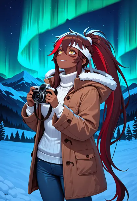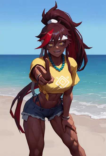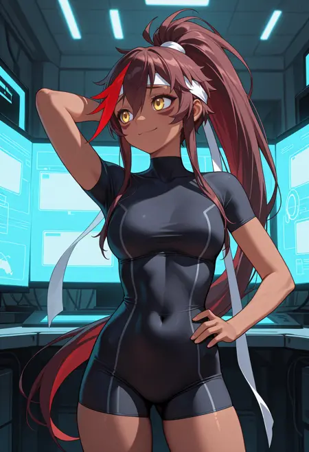 Appearance: dark-skinned female, facial mark, very long hair, streaked hair, brown hair, red hair, hair between eyes, high ponytail, yellow eyes