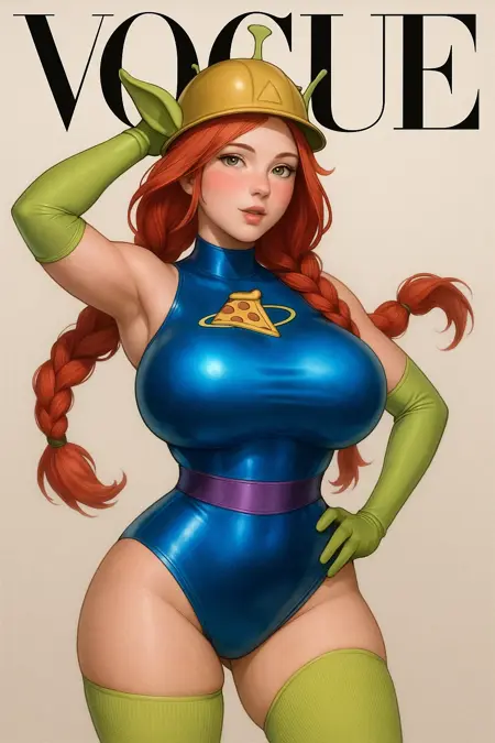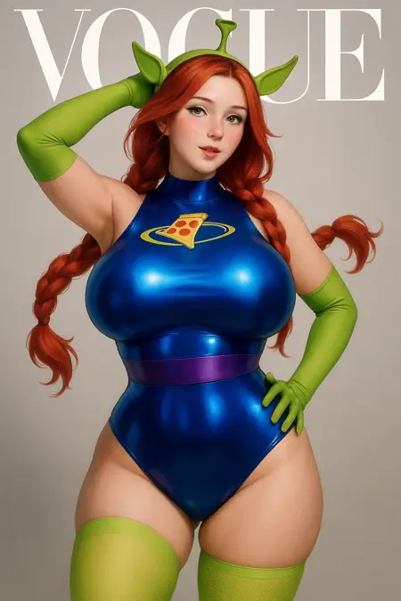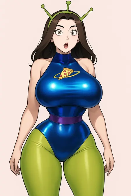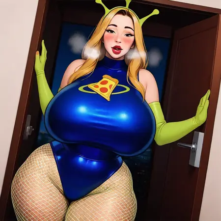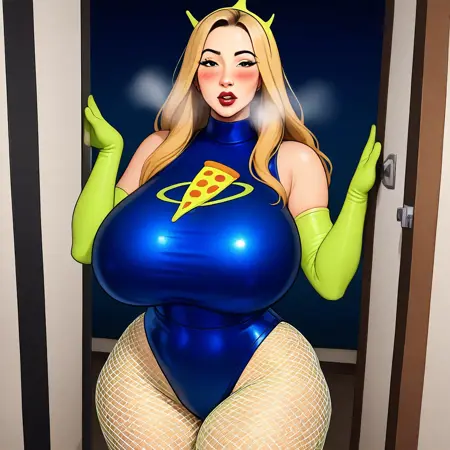 alien costume, sexy costume, pizza logo in the chest, pantyhose, blue leotard, fishnets, leotard, nail polish, horns, hand on hip, tight fit, full-length legs.