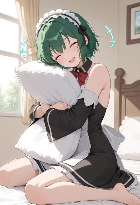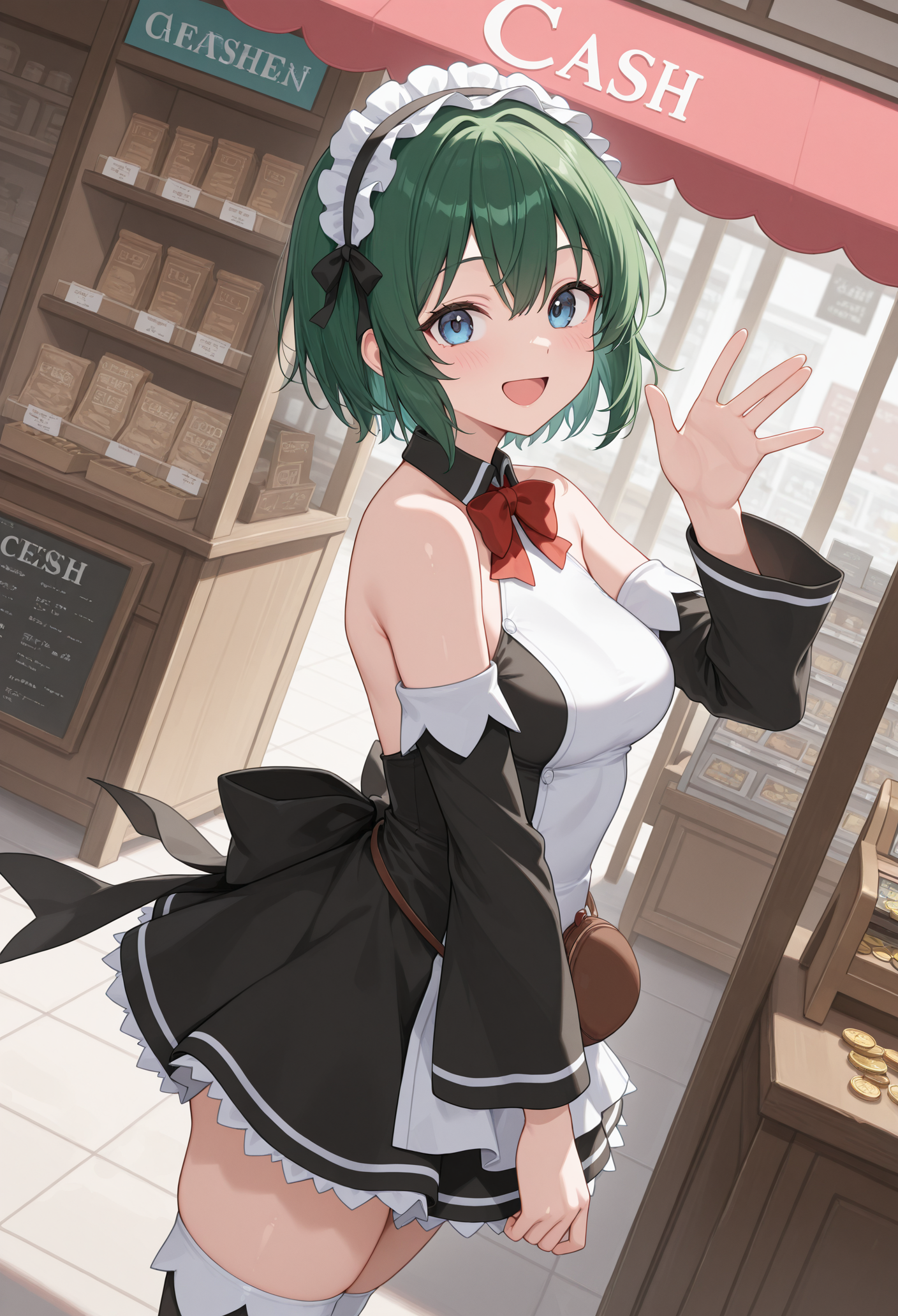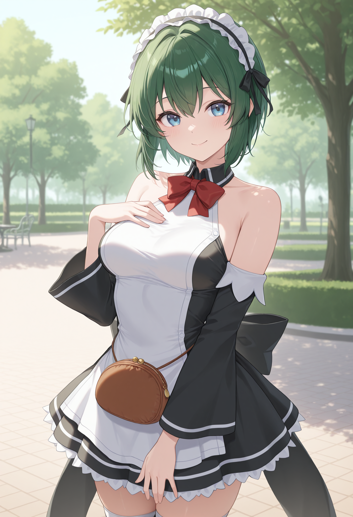maid headdress,bare shoulders,bowtie,detached sleeves,back bow,coin purse,thighhighs,