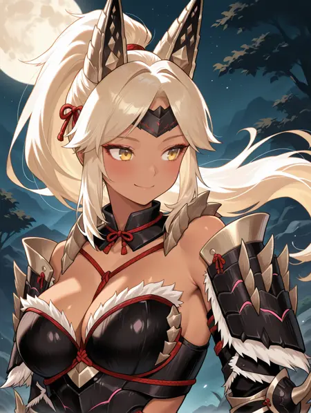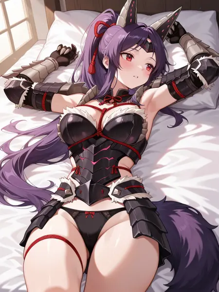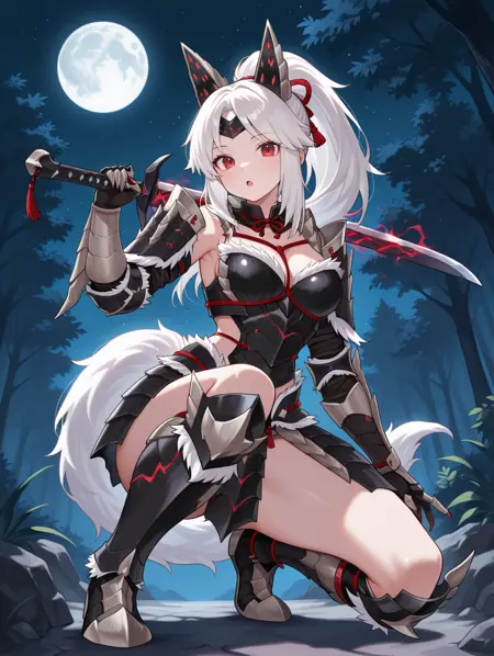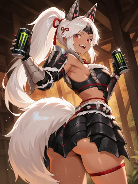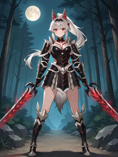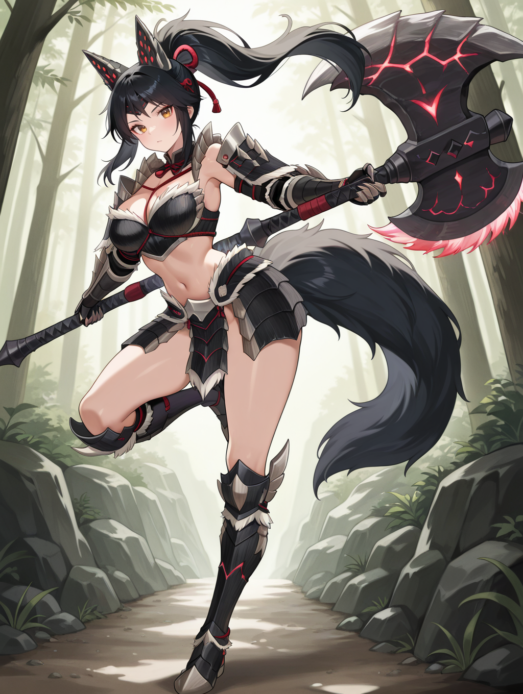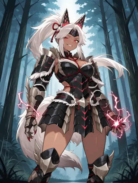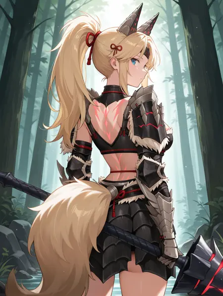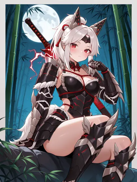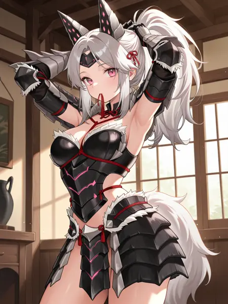 태그(옷): stygian zinogre armor, 높은 언더핀, 빨간 리본, 털 장식, 검은 가짜 동물 귀, 검은 헤드밴드, 검은 목걸이, 검은 어깨 갑옷, 검은 가슴 갑옷, 검은 장갑, 검은 허리 갑옷, 검은 갑옷 부츠
