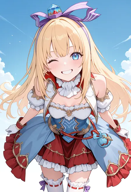 - ilmelyd, hairband, hair ribbon, striped ribbon, purple ribbon, gem hair ornament, mini top hat, gem hat, cropped vest, bare shoulders, detached sleeves, puffy short sleeves, detached collar, strapless shirt, small breasts, white shirt, white gloves, blue dress, gold trim, corset, overskirt, red skirt, frilled skirt, charm \(object\), ribbon-trimmed thighhighs, white thighhighs, frilled thighhighs,