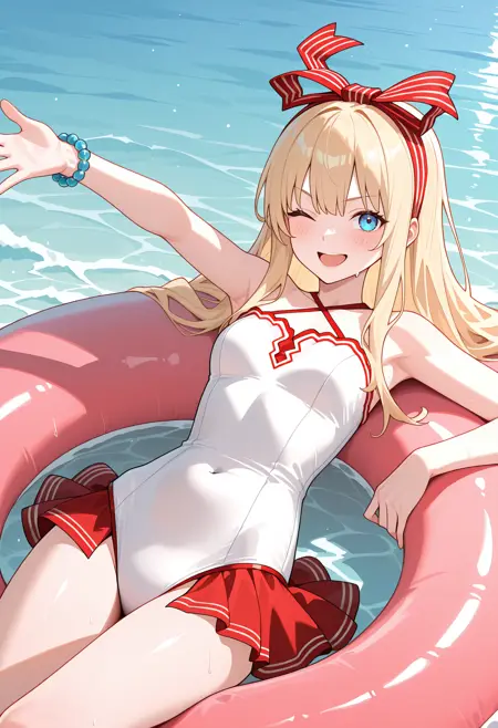 - ilmebik, hairband, hair ribbon, striped ribbon, red ribbon, white one-piece swimsuit, red trim, criss-cross halter, showgirl skirt, red skirt, bead bracelet,