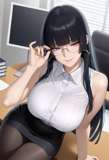 刘海与长发: "T3NGD0A,紫色眼睛,嘴下有痣,黑发,齐刘海,长发,姬发式"