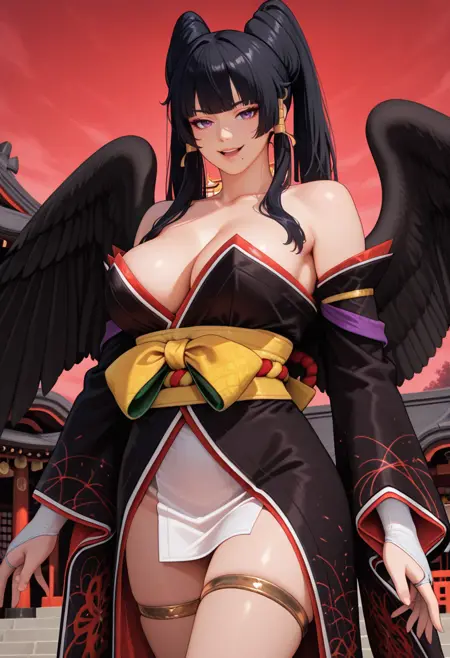 "T3NGD0A,紫色眼睛,嘴下有痣,黑发,双马尾,侧发,头巾,发簪,毛球(衣物),发管,和服,胸露,露肩,黄色腰带,红白绳带,和服裙, detach sleeves,宽袖,白色新娘手套,天狗木屐"