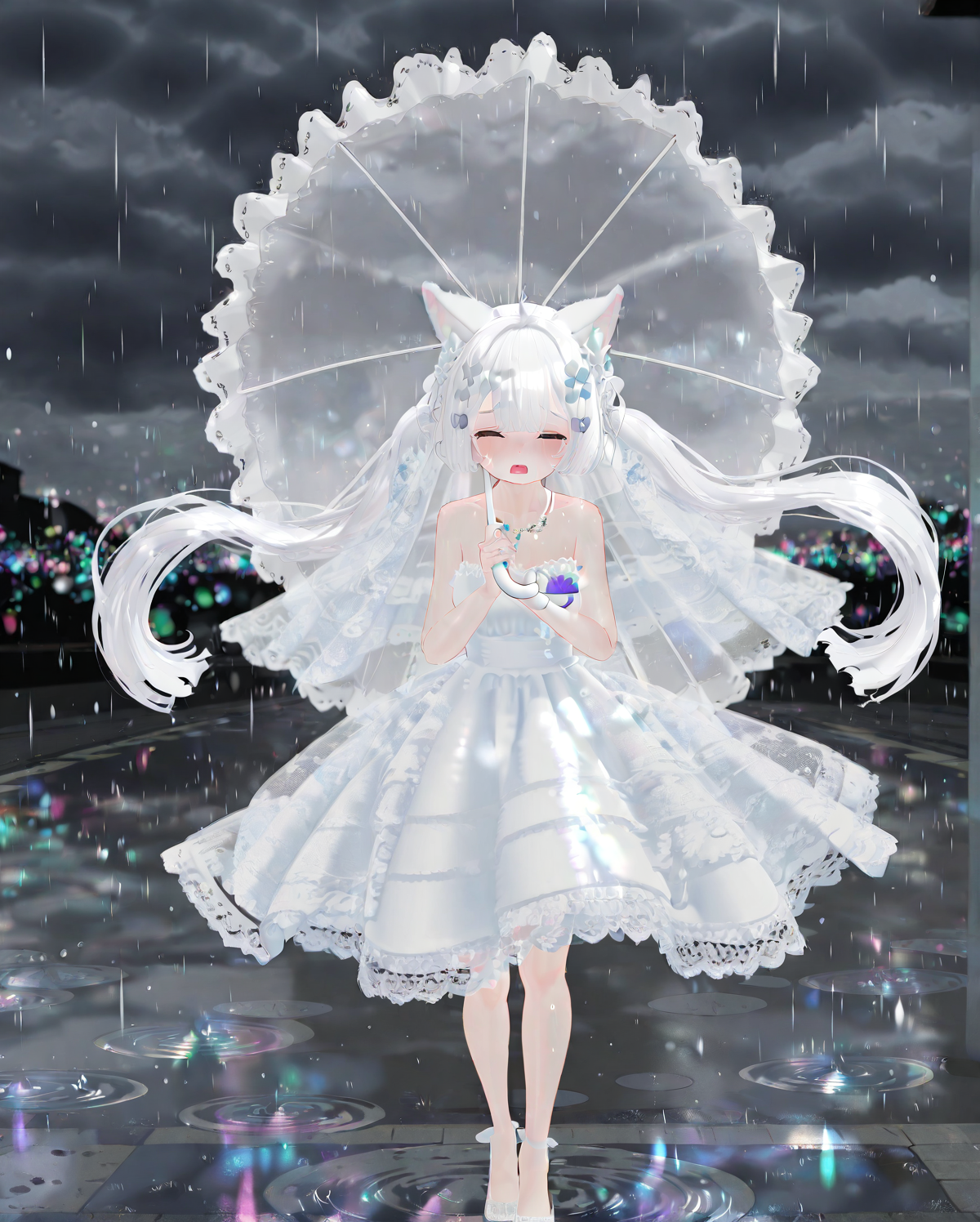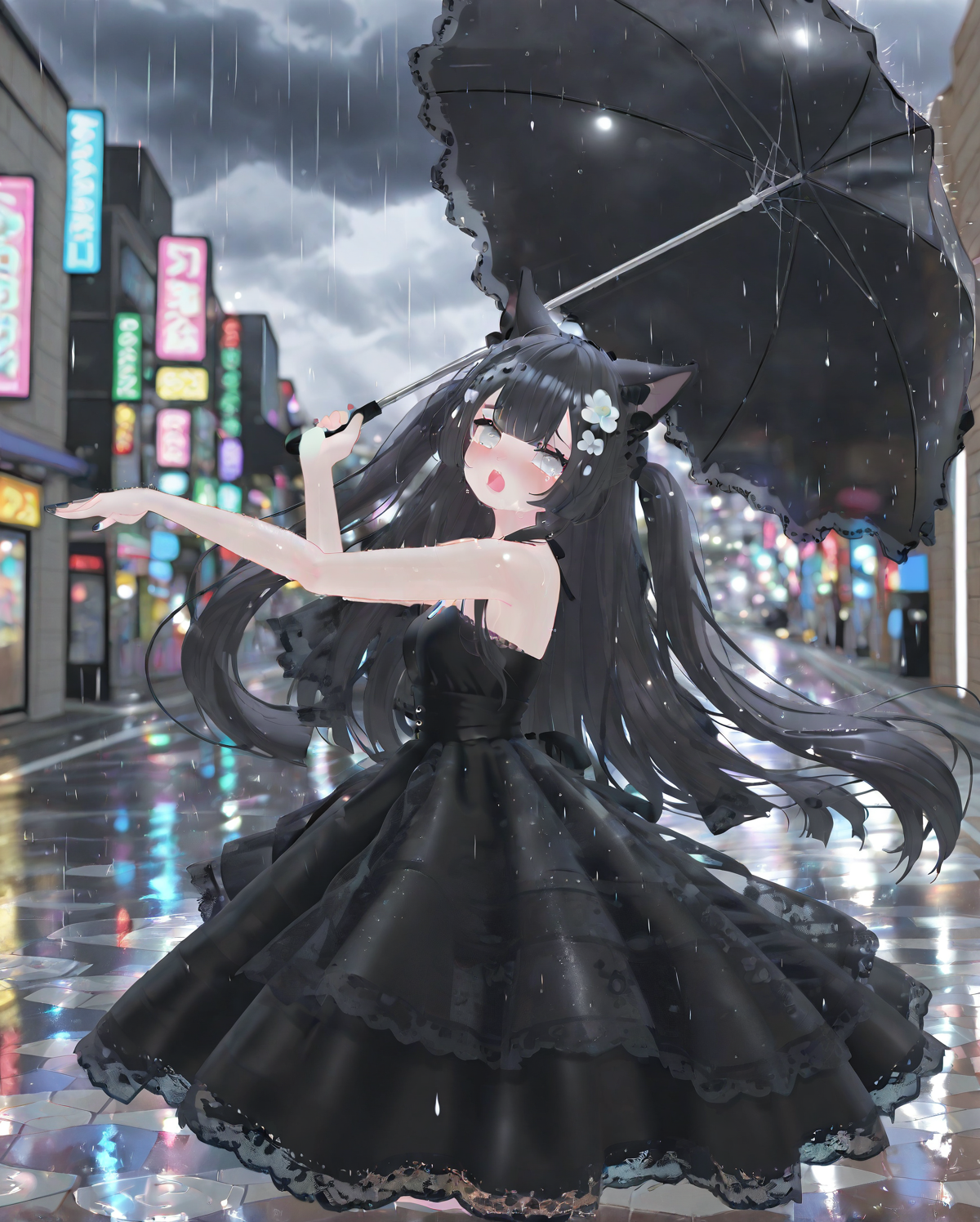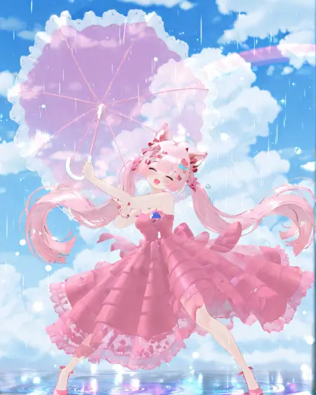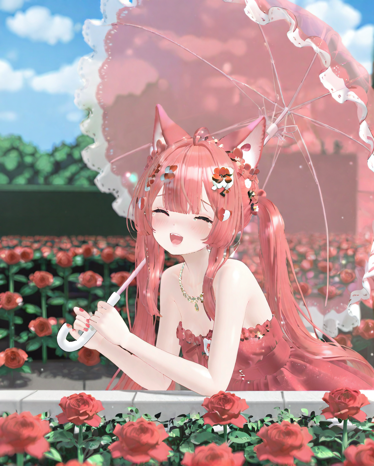 animal ears, pink hair,pink dress,bangs, bare shoulders,blush, bow, dress, eyebrows visible through hair, facing viewer, flower, full body, hair flower, hair ornament, long hair, nail polish, open mouth, sky, smile, solo, very long hair,holding umbrella,