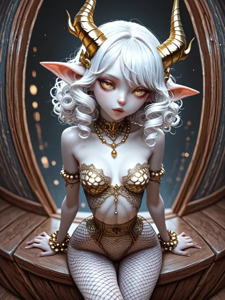 薄い肌、翼、角、ツノ、発光する目、尖った耳、ピンク/オレンジ/レッドの目、長い/短い波状/ストレートの髪、浮き出た静脈、