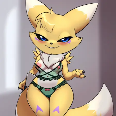 digimon (creature), fox girl, yellow and white fur, blue eyes, black sclera, purple facial marks, black nose, fox ears, fluffy chest tuft, fox tail, black claws, shortstack,