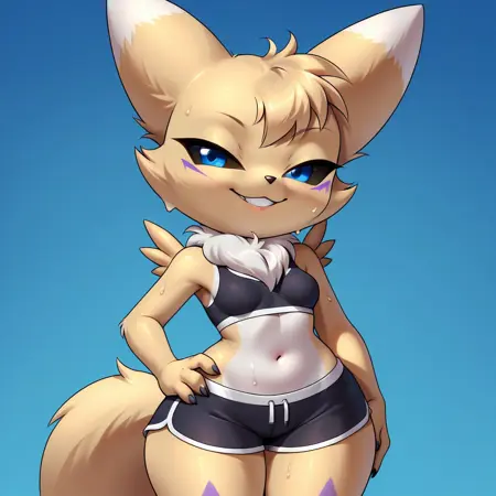 digimon (creature), fox girl, yellow and white fur, blue eyes, black sclera, purple facial marks, black nose, fox ears, fluffy chest tuft, fox tail, black claws, shortstack,