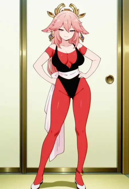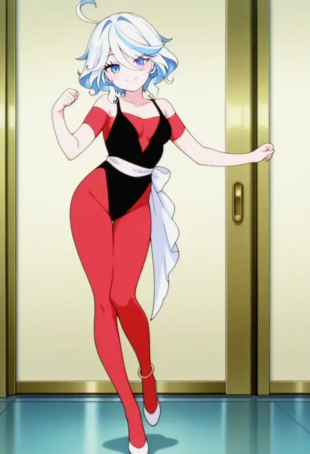 Base outfit :(black leotard:1.2) , red bodysuit, shoulder strap , collarbone , bare shoulders , short sleeves ,red pantyhose , off shoulder , white sash , cosplay ,highleg leotard , white flats , anklet