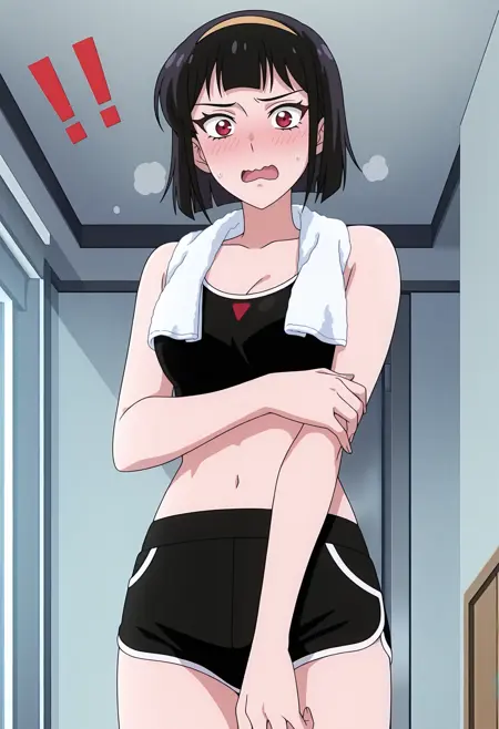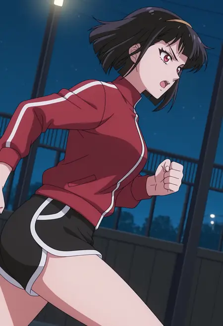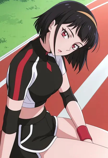 运动装,短袖,黑色露脐上衣,红色露脐上衣,多彩露脐上衣,露腹,海豚短裤,黑色短裤,红色腕带,护肘,运动鞋,