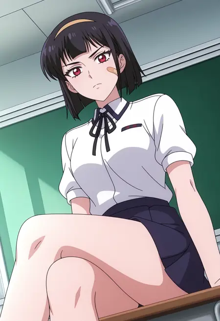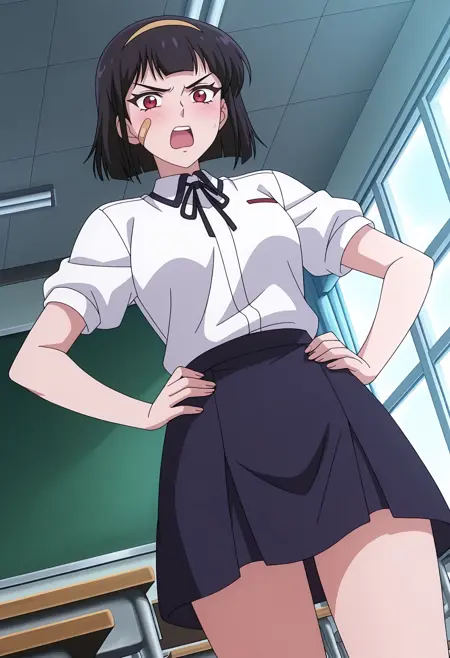 - 校服,脸颊上贴着创可贴,白色衬衫,短袖,有领衬衫,颈带,黑色颈带,蓝色裙子,黑色裙子,