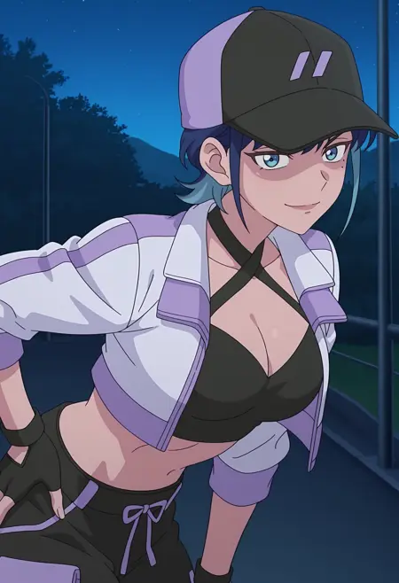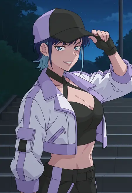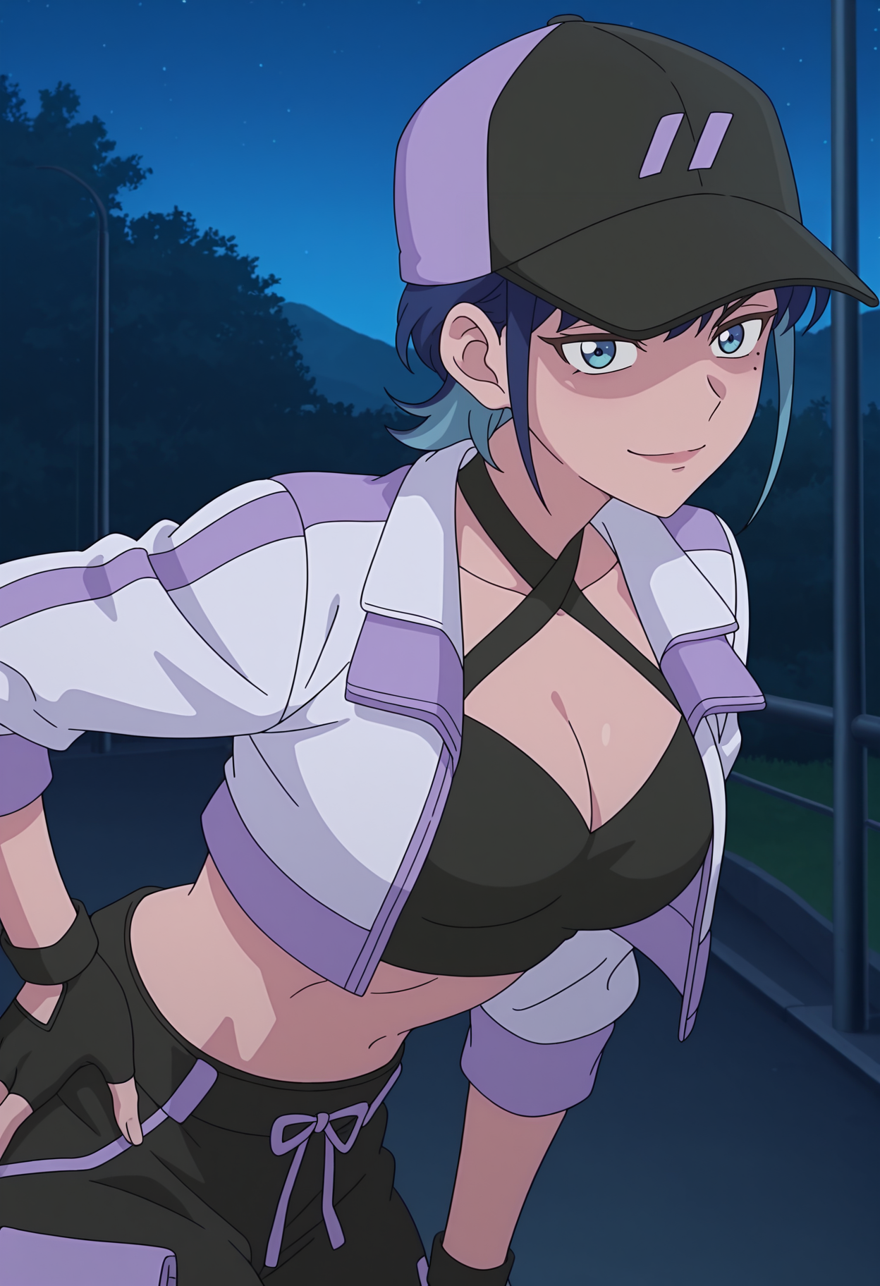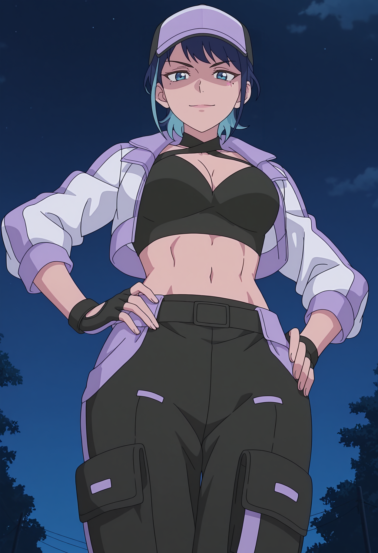 multicolored jacket, purple jacket, white jacket, cropped jacket, two-tone hat, baseball cap, black cap, purple cap, criss-cross halter, black crop top, cleavage, midriff, black pants, pocket, fingerless gloves,